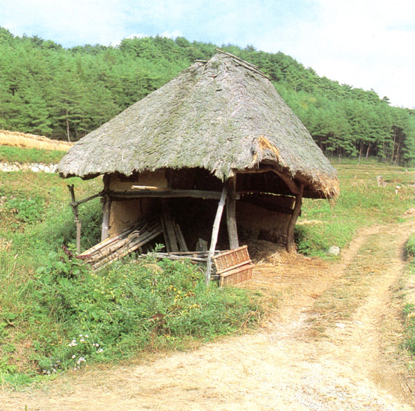 灰小屋は、農家にとって、重要な役割を持つ施設。「灰小屋を見れば農民の腕前が分かる」といわれた。火をたくところだけに、構造は頑丈に出来ている。腰壁は、石と赤土をこねた大きな固まりで積み上げ、厚さは50センチ内外。小屋の4本柱は、「灰小屋柱」といいクリの巨木を使う。屋根は、草屋根で、9尺4方以下の灰小屋には寄棟が多い。一戸建が普通だが、大きな農家になると、連棟式4室という豪壮なものもあった。