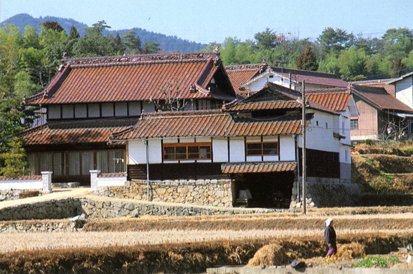 こげ茶の瓦を葺いた白壁の農家の美しいたたずまいが、西条盆地を中心にした、この地方の美しい特徴であるが、これは古くより生活の確立した要衝の場所柄のせいもあろう。しかし、芸藩通志にもこの地方に多く油瓦を製するなりと出ていて、この地の粘土による釉土瓦は丈夫なので、幕末より大正期にかけて、一気に茅葺きが瓦屋に改良される気運を作った。そうして、居蔵造りと称して、上8畳に下6畳、裏側も2間付き、それに土間の付く母屋にはつし2階が広く建て上げられて、母屋が出来、それに椽(たるき)側の廂(ひさし)が付くこととなる。後には上8、下6に更に6畳が付いて、三間流れとなり、土間付き重層入母屋の大屋根の立派な造りとなる。そうして、農家としての納屋、倉、門なども全て油瓦葺きに整えられて、時には作業納屋には2階部屋が設けられたり、裏2階座敷が整えられたりする。それらの農家構えは、油瓦の色彩と白壁と黒い柱などの木部とともに4周の丘陵地や田畑の緑とよく調和して、この地方独特の民家景観を作っている。しかもこの油瓦農家は明治中期より大正初期にかけて一挙に普及の度を進めたものであって、地域環境の美しくなるのも悪化するのも、実は30年内外、1世代で、いずれにでも転化してしまうことのよき例でもある。